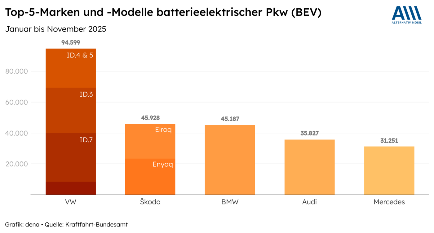 Die Anzahl von Modellen batterieelektrischer Pkw nimmt stetig zu. In Deutschland werden inzwischen hunderte Modelle verschiedener Hersteller in allen wichtigen Segmenten angeboten. Darunter schneiden deutsche Fahrzeughersteller sehr gut ab. Im Ranking der meist zugelassenen Elektromodelle im Jahr 2025 entfallen alle 5 der Top-5-Modelle auf deutsche Konzernmarken. BEVs erreichten 2025 einen Anteil von 19 Prozent an allen Pkw-Neuzulassungen in Deutschland (+5 Prozentpunkte gegenüber dem Vorjahreszeitraum).
